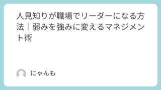 人 人見知りが職場でリーダーになる方法|弱みを強みに変えるマネジメント術 人見知りはリーダーに不向き?実は傾聴力・誠実さ・観察力を強みにすれば信頼されるリーダーになれます。具体的なマネジメント術や心構えを解説します。 2025.10.02 人