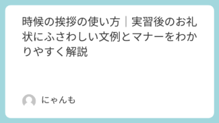 挨拶例文 時候の挨拶の使い方|実習後のお礼状にふさわしい文例とマナーをわかりやすく解説 実習後のお礼状にふさわしい時候の挨拶の使い方を解説。季節別の文例、結びの挨拶、避けたいNG表現までまとめ、丁寧で好印象なお礼状が書けます。 2025.10.02 挨拶例文