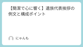 弔事 【簡潔で心に響く】遺族代表挨拶の例文と構成ポイント 遺族代表挨拶は短くても心に響きます。本記事では構成ポイントに加え、通夜・葬儀・火葬場・精進落としの例文、宗教別や英語の挨拶、体験談、テンプレート集を紹介。 2025.10.02 弔事挨拶例文