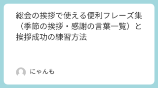 挨拶例文 総会の挨拶で使える便利フレーズ集(季節の挨拶・感謝の言葉一覧)と挨拶成功の練習方法 総会の開会挨拶・閉会挨拶を例文付きで解説。テンプレート、服装、チェックリスト、進行シナリオ、トラブル対処法、要点まとめ一覧まで網羅した10ページの完全保存版マニュアル。 2025.10.01 挨拶例文