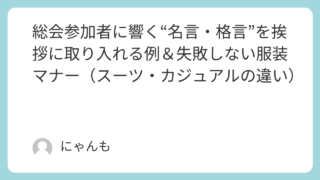 挨拶例文 総会参加者に響く“名言・格言”を挨拶に取り入れる例&失敗しない服装マナー(スーツ・カジュアルの違い) 総会の開会挨拶・閉会挨拶を例文付きで解説。テンプレート、服装、チェックリスト、進行シナリオ、トラブル対処法、要点まとめ一覧まで網羅した10ページの完全保存版マニュアル。 2025.10.01 挨拶例文