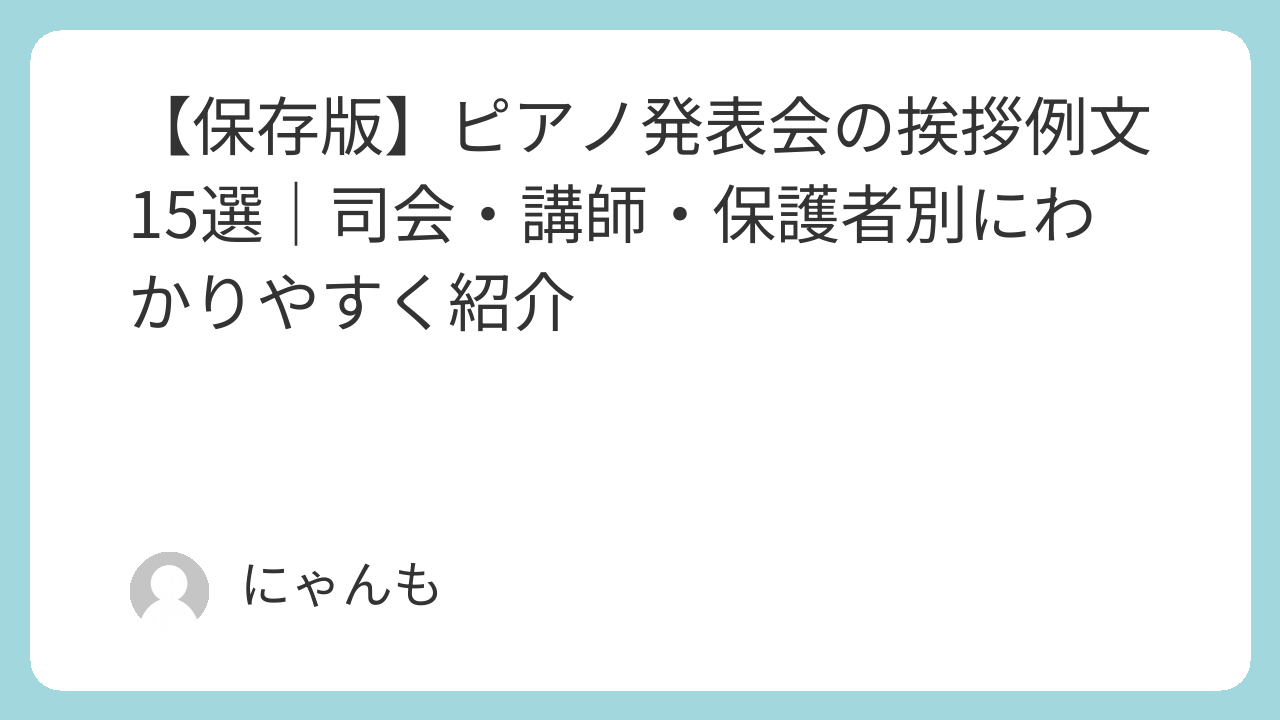 「本日は〇〇ピアノ教室の発表会にお越しいただき、心より御礼申し上げます。生徒の皆さんが練習を重ね、今日の舞台で自分らしい音色を響かせてくれました。ご家族の温かいサポートにも深く感謝いたします。今後も音楽を通して豊かな時間をお届けできれば幸いです。」
