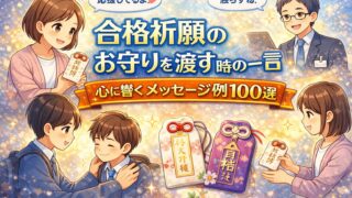 イベント 合格祈願のお守りを渡す時の一言|心に響くメッセージ例100選 合格祈願のお守りを渡す時の一言メッセージ100選。親・友達・恋人・先生から使える心に響く短文例を紹介。プレッシャーを与えない優しい言葉を厳選した保存版。 2026.02.05 イベント例文