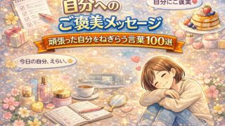 例文 自分へのご褒美メッセージ|頑張った自分をねぎらう言葉100選 自分へのご褒美メッセージ100選。仕事・勉強・日常で頑張った自分をねぎらう優しい言葉を紹介。心が疲れたとき、自己肯定感を高めたいときに読みたい一言集。 2026.02.07 例文