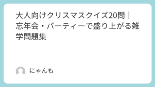 楽 大人向けクリスマスクイズ20問|忘年会・パーティーで盛り上がる雑学問題集 大人向けクリスマスクイズ20問を答え付きで紹介。忘年会やパーティーで盛り上がる雑学クイズを初級〜上級まで収録。司会進行にもそのまま使える問題集です。 2025.12.14 楽