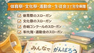 例文 学校行事のスローガン例文集|体育祭・文化祭・運動会・生徒会まで完全網羅 学校行事のスローガン例文を完全網羅。体育祭・文化祭・修学旅行・生徒会・運動会(保育園・小学校・中学校)まで、行事別に使えるスローガンを分かりやすく紹介します。 2026.01.16 例文行事