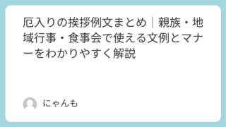 イベント 厄入りの挨拶例文まとめ|親族・地域行事・食事会で使える文例とマナーをわかりやすく解説 厄入りの挨拶に悩む方へ。親族・地域行事・食事会など場面別に使える挨拶例文をまとめて紹介。短い文例から正式な挨拶、厄年の意味やマナー、NG表現までわかりやすく解説した完全ガイドです。 2025.12.04 イベント挨拶例文