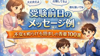イベント 受験前日のメッセージ例|不安を和らげる励ましの言葉100選 受験前日に送るメッセージ例を100選紹介。不安を和らげる励ましの言葉を親・友達・先生別に掲載。頑張れと言わない、プレッシャーを与えない短文フレーズ集。 2026.02.02 イベント例文