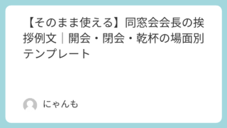 挨拶例文 【そのまま使える】同窓会会長の挨拶例文|開会・閉会・乾杯の場面別テンプレート 同窓会会長の挨拶は短くても心が伝わります。本記事では【そのまま使える】開会・乾杯・閉会の例文に加え、年代別の言葉遣い、英語表現、一問一答形式テンプレートを紹介します。 2025.10.23 挨拶例文