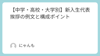 挨拶例文 【中学・高校・大学別】新入生代表挨拶の例文と構成ポイント 中学・高校・大学の入学式で使える「新入生代表挨拶」の例文と構成ポイントを紹介。場面別の文例と感動を生む話し方のコツで、堂々と自信を持って式典に臨めます。 2025.10.28 挨拶例文