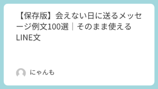 例文 【保存版】会えない日に送るメッセージ例文100選|そのまま使えるLINE文 会えない日に送るメッセージ例文を100選紹介。恋人・好きな人・遠距離など関係性別に、LINEでそのまま使える重くならない短文をまとめた保存版記事です。 2025.12.13 例文
