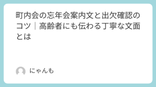 挨拶例文 町内会の忘年会案内文と出欠確認のコツ|高齢者にも伝わる丁寧な文面とは 町内会の忘年会案内文と出欠確認のコツを徹底解説。高齢者に伝わる文例、返信ハガキや電話対応、二次会・送迎・会費徴収・進行例・挨拶文例・余興アイデア、幹事チェックリスト、さらにFAQまで網羅した完全マニュアル。 2025.09.28 挨拶例文案内文