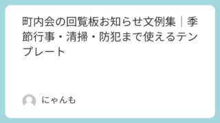 挨拶例文 町内会の回覧板お知らせ文例集|季節行事・清掃・防犯まで使えるテンプレート 町内会の回覧板お知らせ文例集。季節行事・清掃・防犯・防災・子ども会・敬老会・資源回収まで使えるテンプレートを紹介。幹事チェックリストとFAQ付きで、運営やトラブル対応も安心。 2025.09.27 挨拶例文案内文