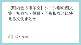 挨拶例文 【町内会の挨拶文】シーン別の例文集|初参加・役員・回覧板などに使える文例まとめ 町内会で使える挨拶文をシーン別に紹介。初参加・役員就任・回覧板・季節行事などの例文集をまとめ、使いやすいフレーズを解説します。 2025.09.28 挨拶例文