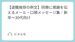 挨拶例文 【退職挨拶の例文】同僚に感謝を伝えるメール・口頭メッセージ集|新卒~30代向け 同僚への退職挨拶に悩む方へ。新卒~30代向けに、メール・口頭・チャットで使える例文とメッセージ集を紹介。感謝と前向きな気持ちが伝わる文例テンプレ付き。 2025.10.07 挨拶例文