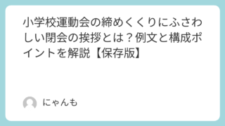 挨拶例文 小学校運動会の締めくくりにふさわしい閉会の挨拶とは?例文と構成ポイントを解説【保存版】 小学校運動会の閉会挨拶で悩む方へ。校長先生・先生・PTA・児童代表の立場別例文と構成ポイントを紹介。感謝と感動で締めくくる心に残るスピーチを解説! 2025.10.04 挨拶例文