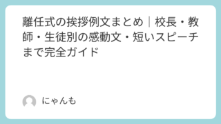 イベント 離任式の挨拶例文まとめ|校長・教師・生徒別の感動文・短いスピーチまで完全ガイド 離任式の挨拶に悩む方へ。校長・教師・生徒別の例文から短いスピーチまでまとめて紹介。感動を生む挨拶の作り方やNG例も解説。すぐ使える例文で準備がスムーズに。 2025.11.27 イベント挨拶例文