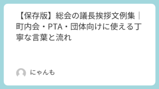 挨拶例文 【保存版】総会の議長挨拶文例集|町内会・PTA・団体向けに使える丁寧な言葉と流れ 総会の議長挨拶文例を紹介。町内会・PTA・団体で使える開会・進行・閉会の丁寧な挨拶と流れを解説し、スムーズな総会運営に役立ちます。 2025.10.21 挨拶例文
