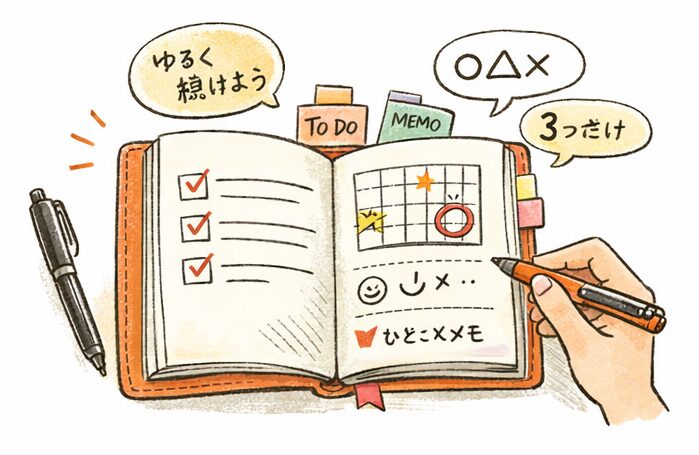どんなに良い手帳アイデアでも、続かなければ意味がありません。続けるために意識したいポイントは以下の通りです。
